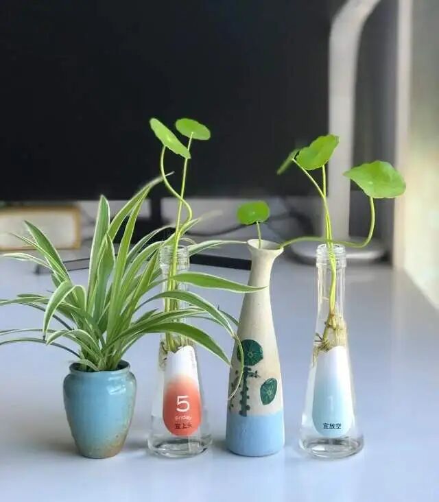 因为修剪小吊兰育苗和分株的时间都发生在温度偏高的时间,在这个时候环境温度大多持续稳定在15℃以上,为了尽快的让新生的吊兰长出健壮的根,我们最好采用水培的方式“诱根”。
