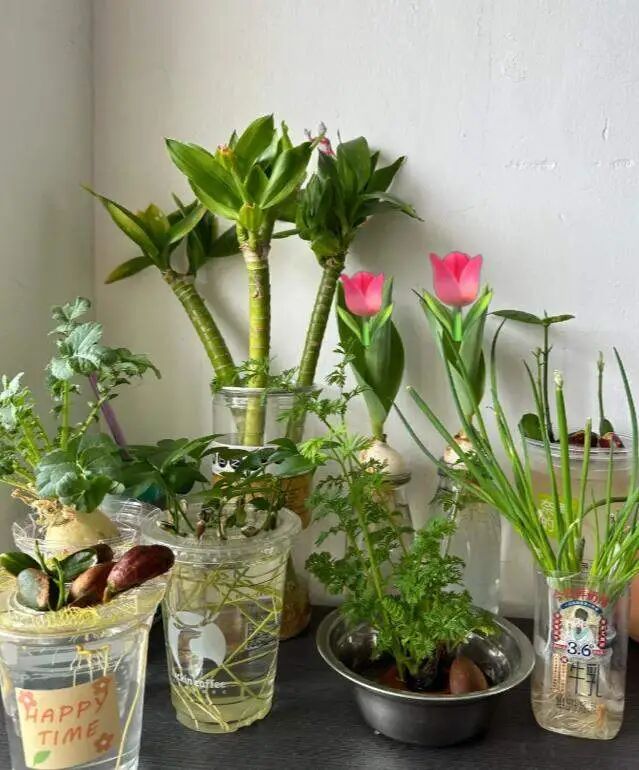薄荷、青苹果竹芋、多肉佛珠、铜钱草、郁金香、百合、绿萝、吊兰、龟背竹等都是常见的水培植物。