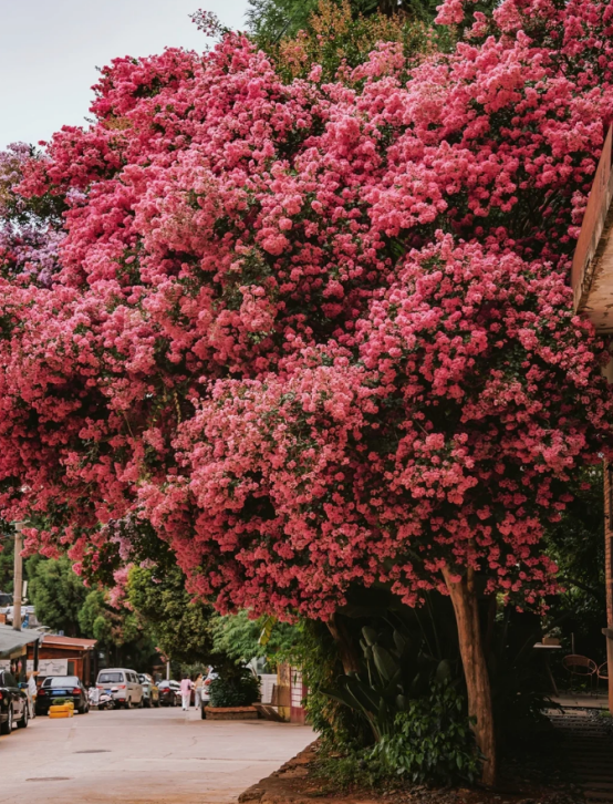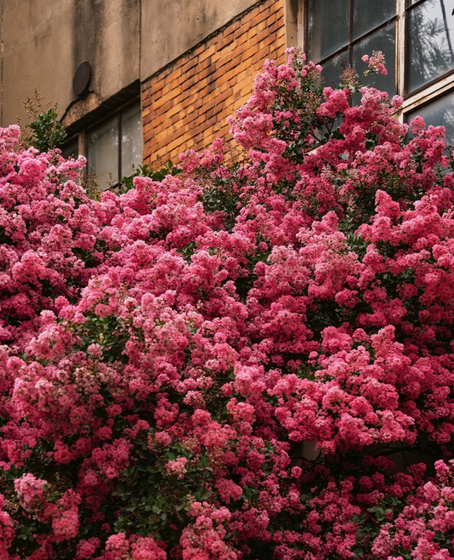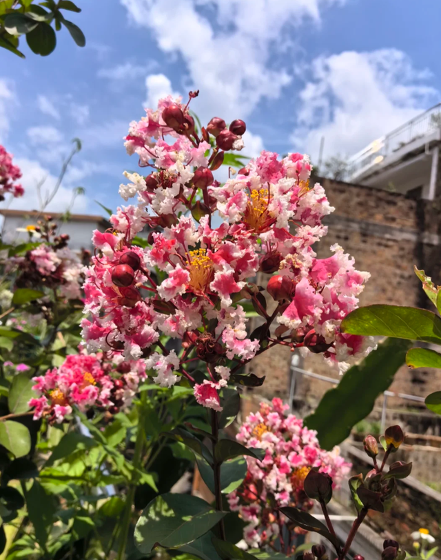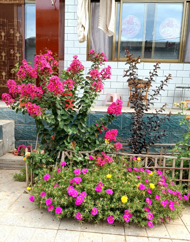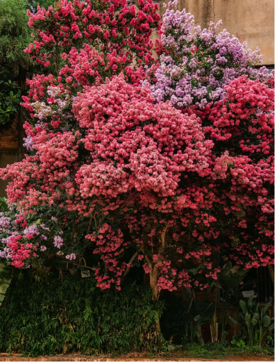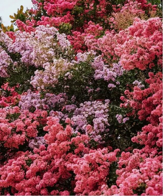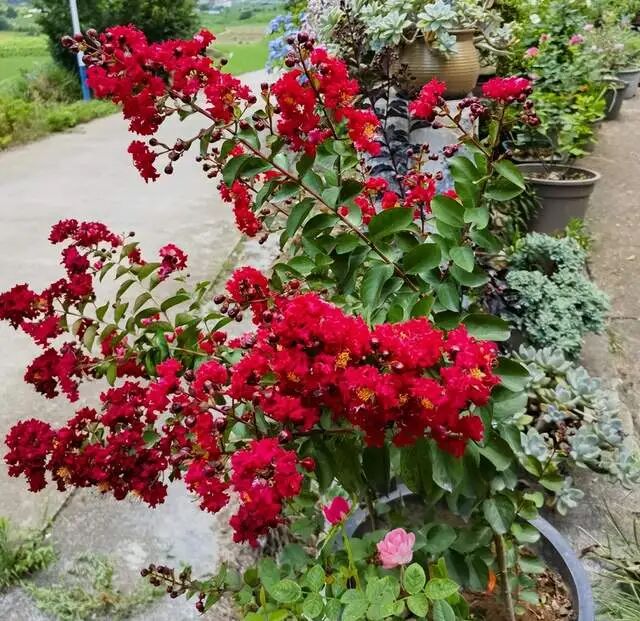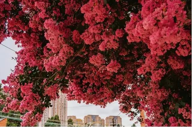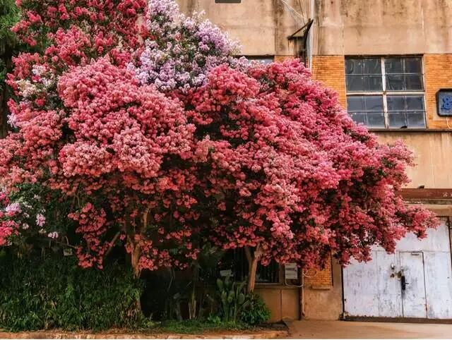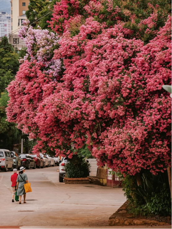 因为云南这户人家门口的紫薇花树并不是独一份,形成这种壮观的景象,一方面得益于云南四季温暖如春的气候环境,另外一方面则得益于地栽的种植方式。