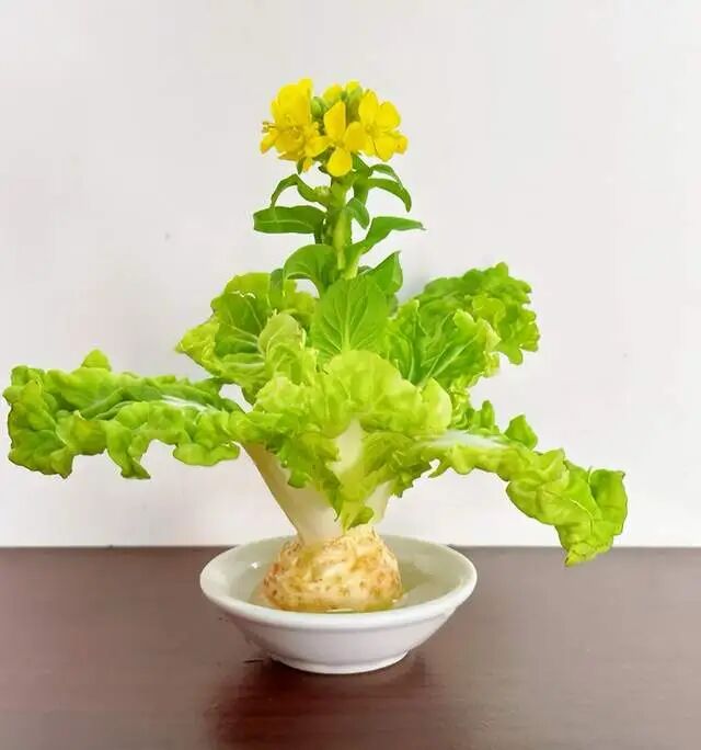 这样放在容器里水培,长出的叶子可以采摘下来烹饪成新的美味,开出的花金灿灿的,随便放在哪里都是一道亮丽的风景线。