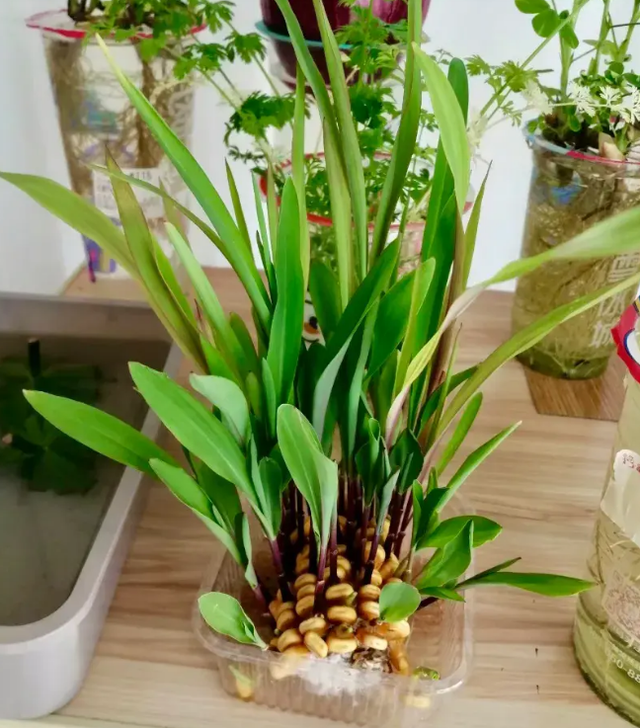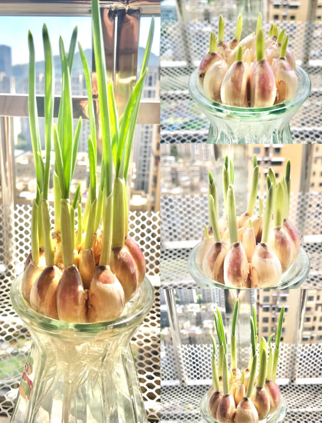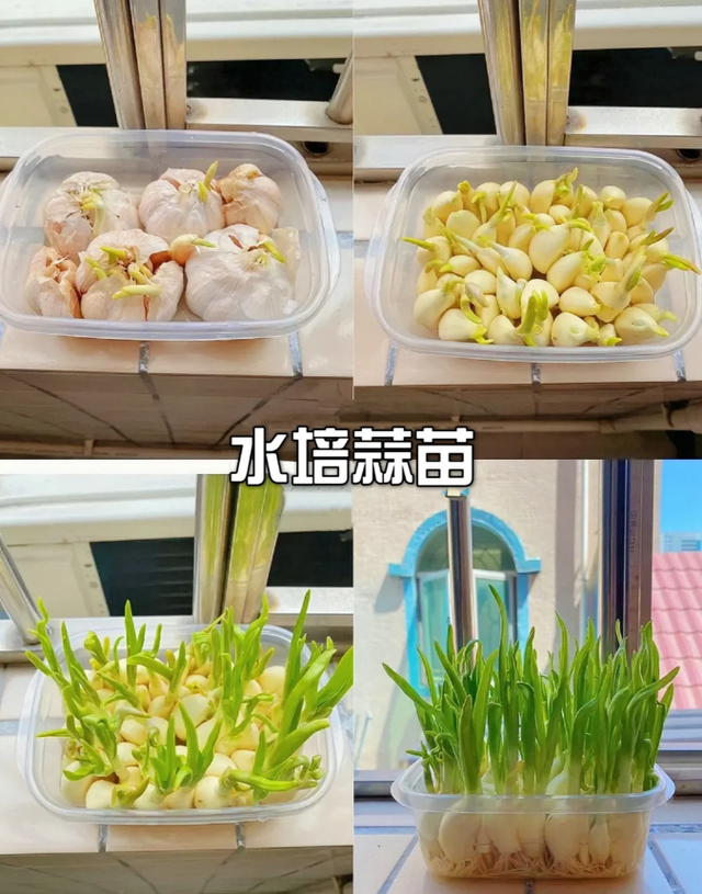我们只需要准备上一个容器盛上水,然后把大蒜一个个整齐有序的排列好,然后放在光照充足的地方,保证一直有充足的水,隔两三天就换一次水,防止水变质滋生臭味。