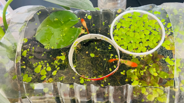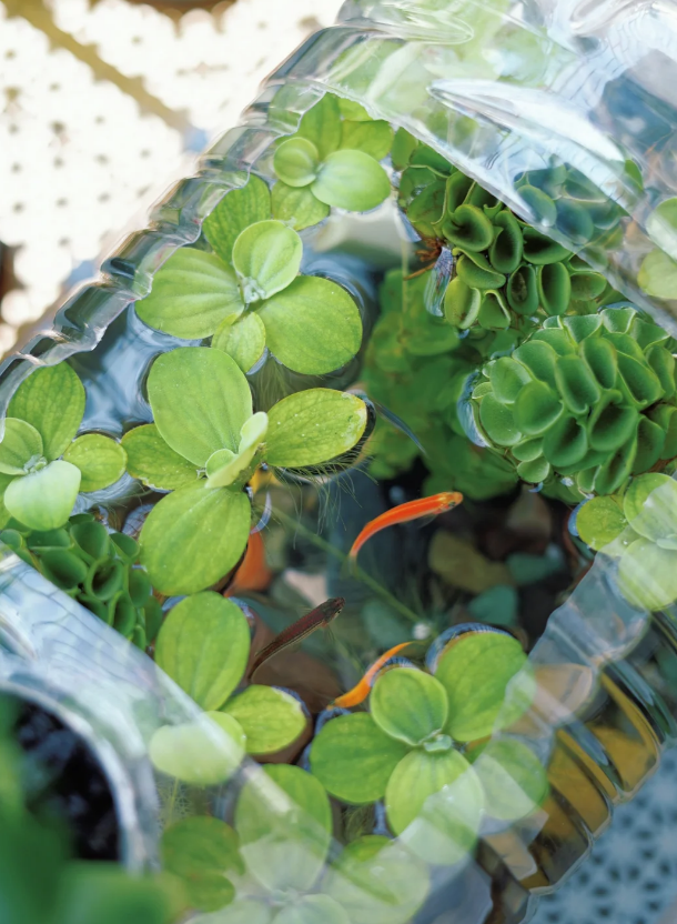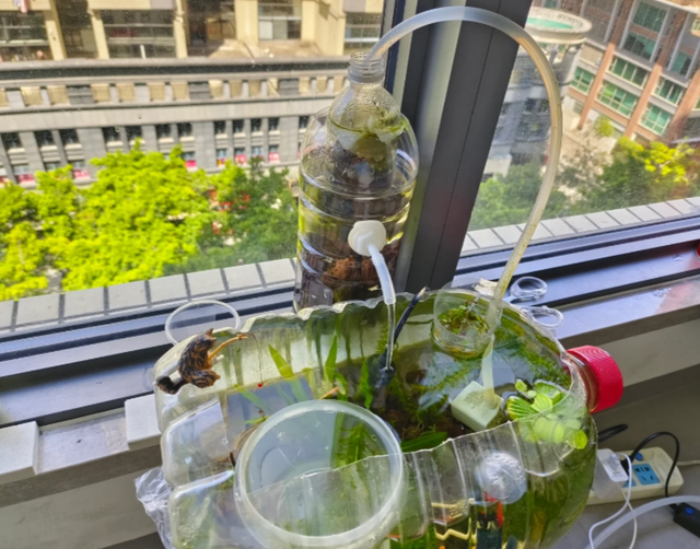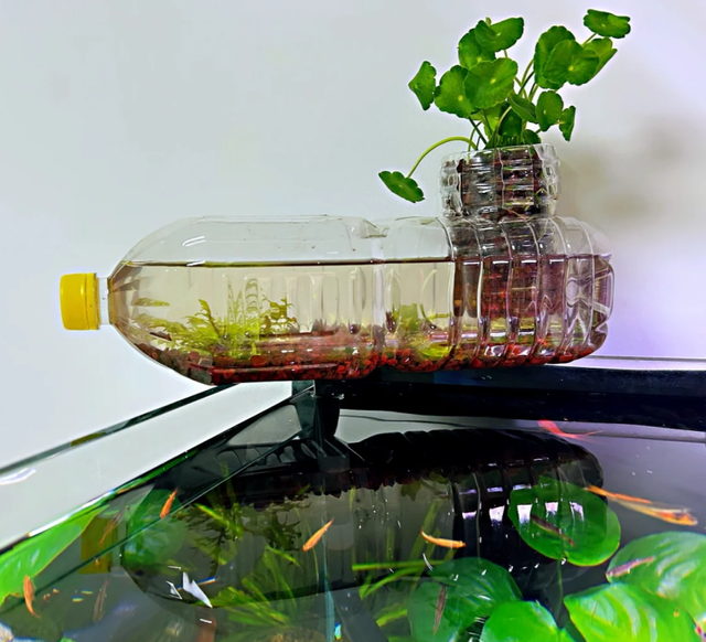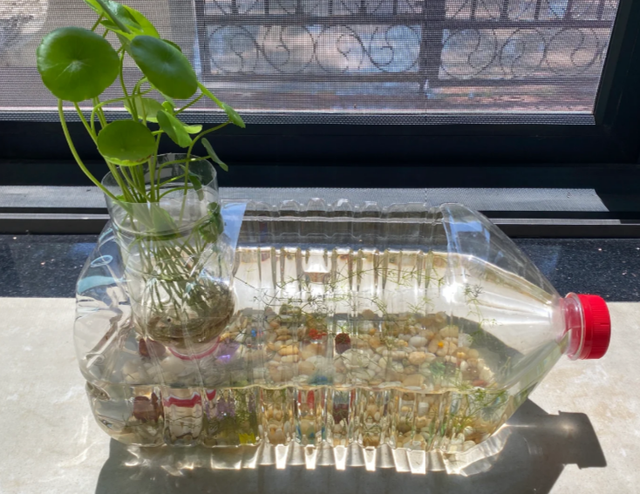 瞧!这就是利用5升和550毫升的矿泉水瓶子制作出的生态鱼缸。