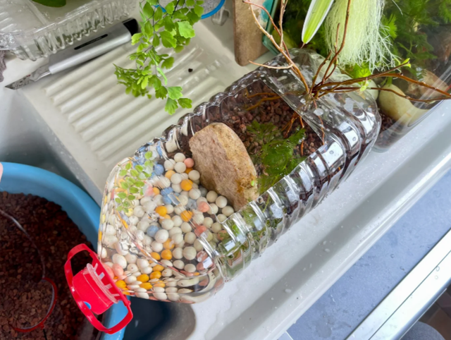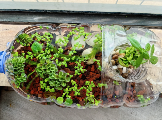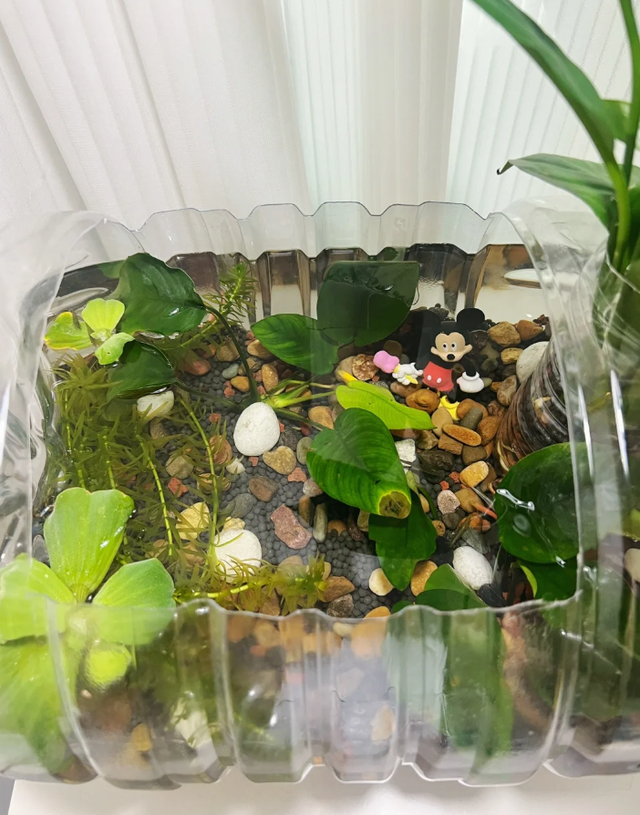 这样就可以形成一个独一无二的鱼缸了,再往里边放入植物和石头,形成一个完整的生态系统,养花草和鱼,难度直接就能拉到底。
