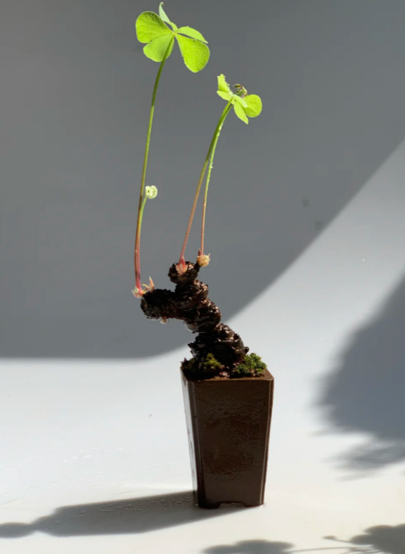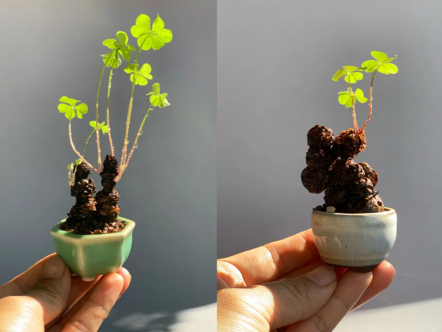 “普通的三叶草通常需要1~2年的时间才能够蜕变成老桩,自然,我们若想要立马得到三叶草老桩就只能花钱买,或从大自然里找寻,比如路边、人迹罕至的公园……”