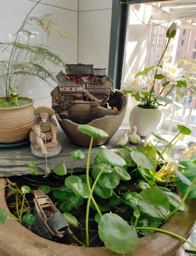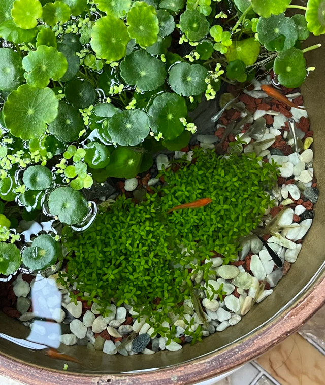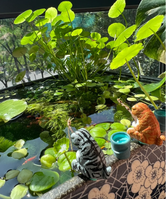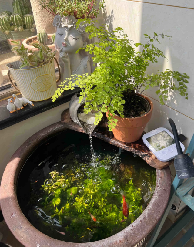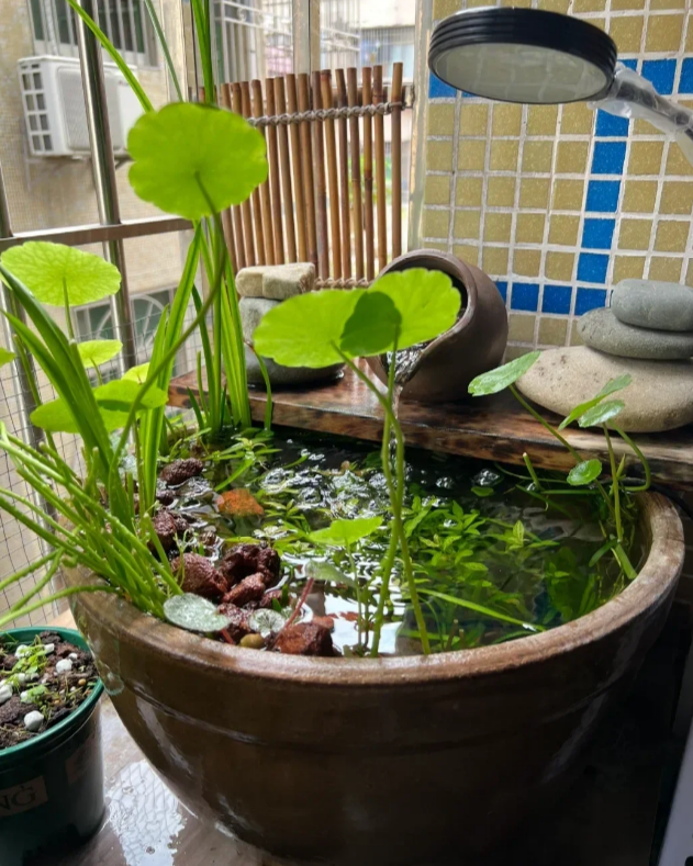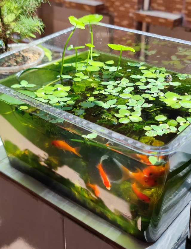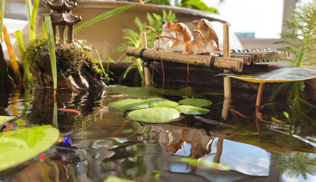 随着鱼儿的游动,水波在荡漾,水草和铜钱草仿佛在跳舞,确实看着很治愈!