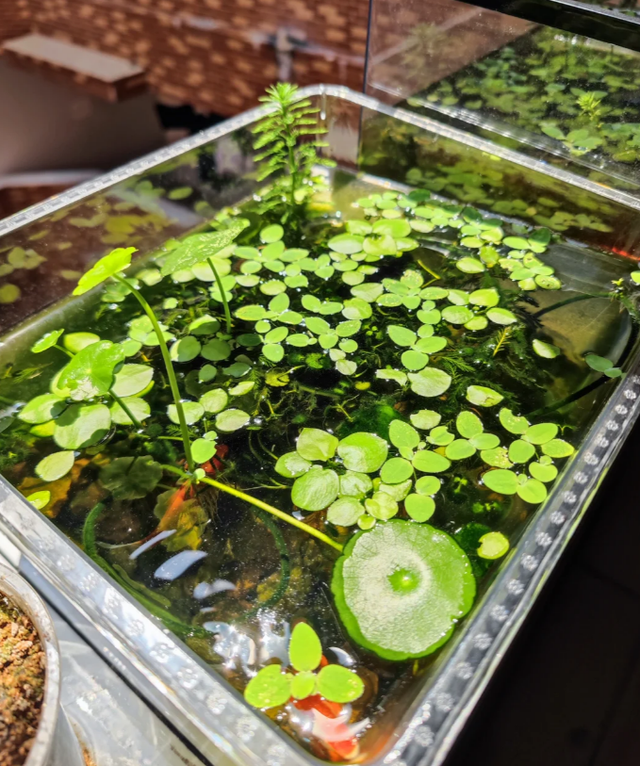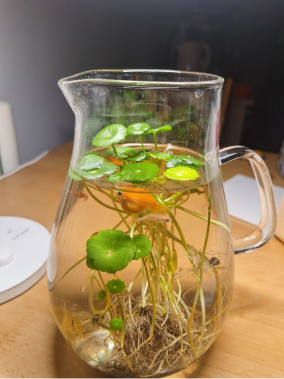 透明的鱼缸里种着数不清的铜钱草以及各种水草,相互交缠在一起,让人分不清哪个是铜钱草,哪个是水草……