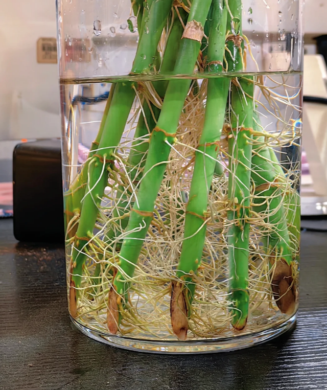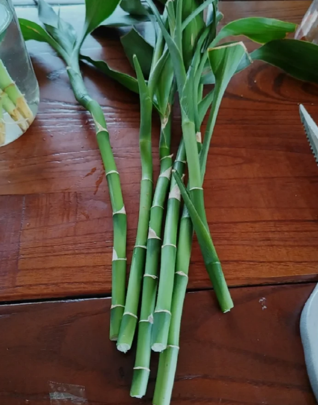 不仅如此,还要清理掉富贵竹靠近根部的大部分叶子,并且把根部位置修剪成45度倾斜角尽可能的增大和水面的接触面积方便富贵竹尽早生根发芽。