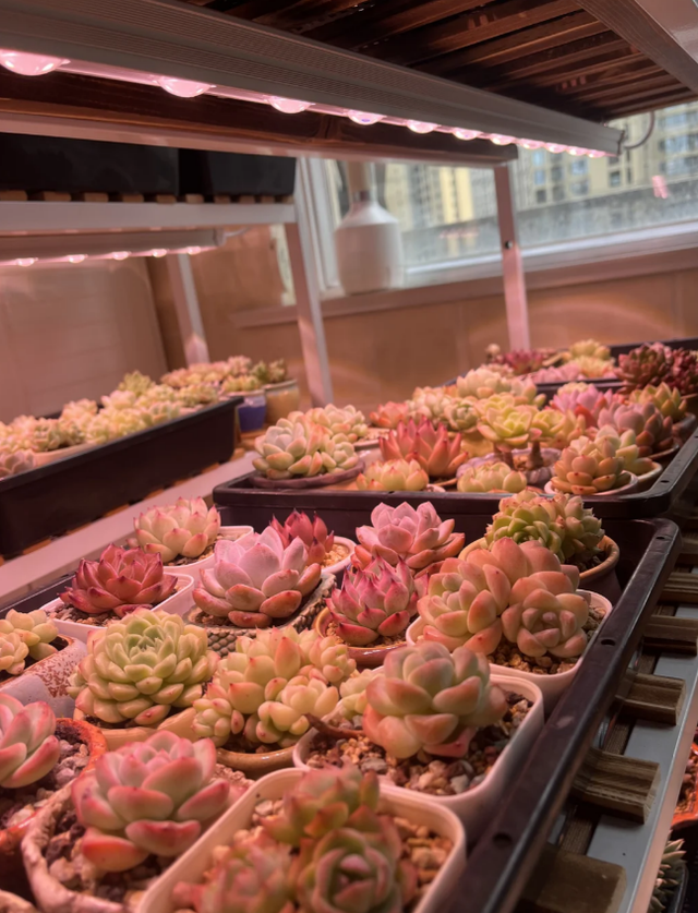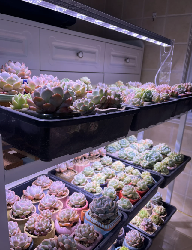 夏季养殖即使放在室内也要给足多肉植物充足的光照,要根据多肉植物的品种,及时的在自然光照不足的情况下,使用植物专用的补光灯补充光照。