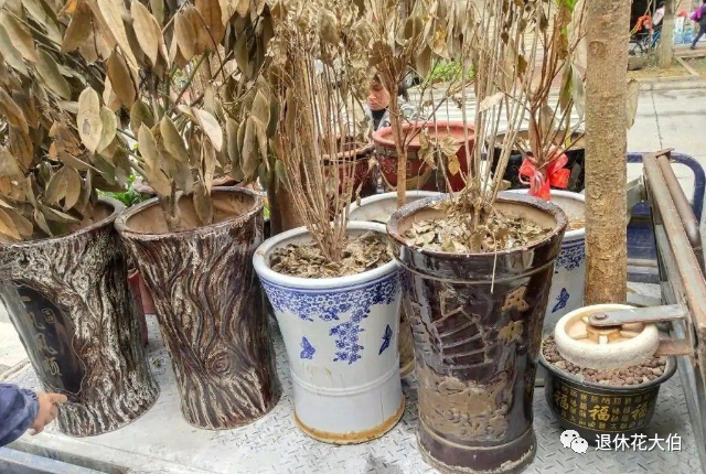 这类的花盆,看上去非常的贵气!许多市场上出售的大型发财树、幸福树、金钱树等等都是使用这种花盆种植。