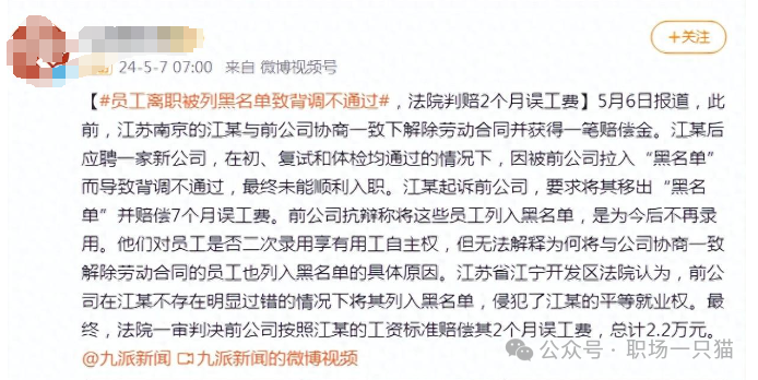 江苏省江宁开发区法院认为,前公司在江某不存在明显过错的情况下将其列入黑名单,侵犯了江某的平等就业权。