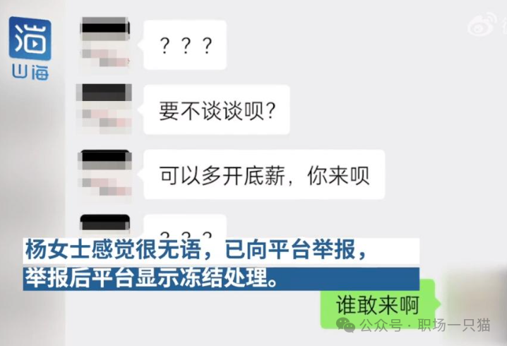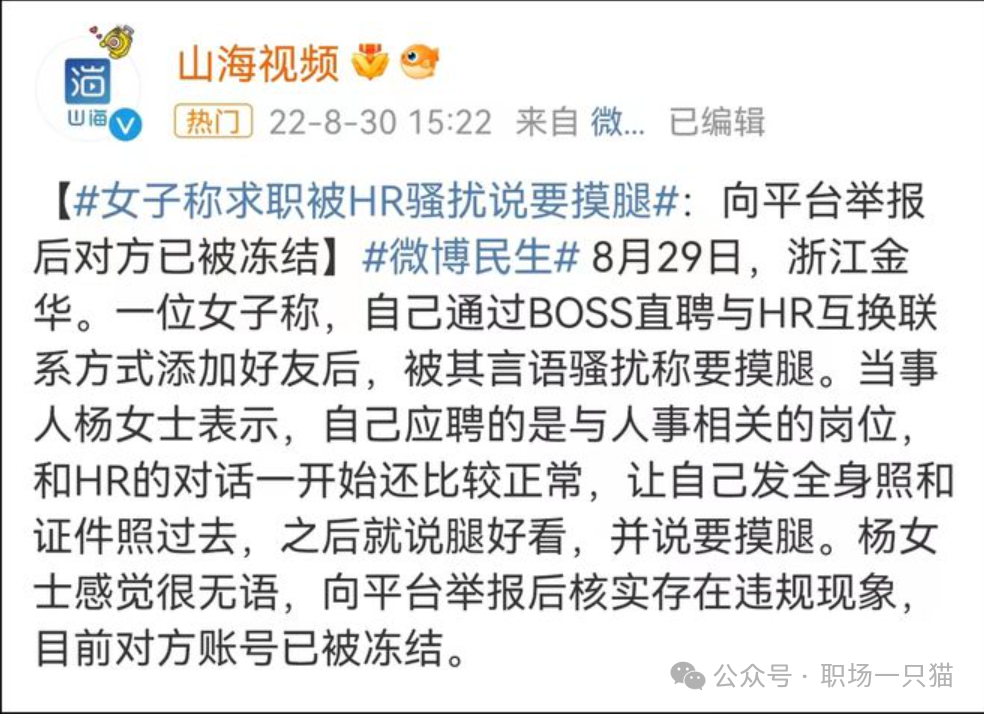前几年,一位浙江金华的女子称,自己通过BOSS直聘与HR互换联系方式添加好友后,被其言语骚扰称要摸腿。