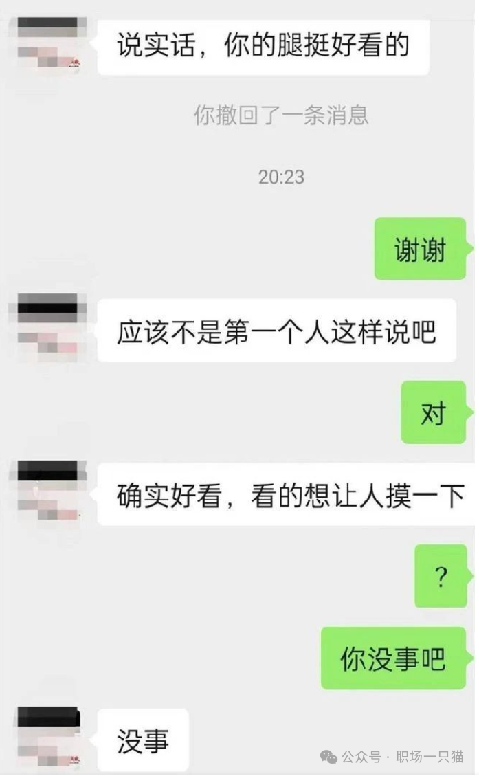 当事人杨女士表示,自己应聘的是与人事相关的岗位,和HR的对话一开始还比较正常,让自己发全身照和证件照过去,之后就说腿好看,并说要摸腿。
