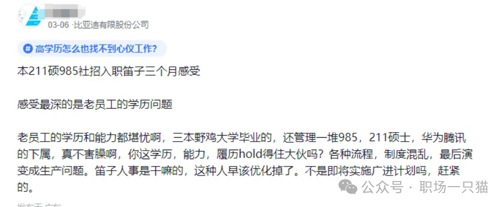 一位新加入比亚迪的员工在网络上发表意见:“我是985大学硕士毕业,入职BYD三个月,看着资深员工仅有三本院校的学历,却管理着我们这群211和985的研究生,他们真的有能力胜任管理工作吗?