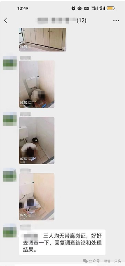 网传截图显示,在一个聊天群内,“谢经理”发了3名疑似员工在7月18日上午9:52和9:53如厕刷手机的私密照。