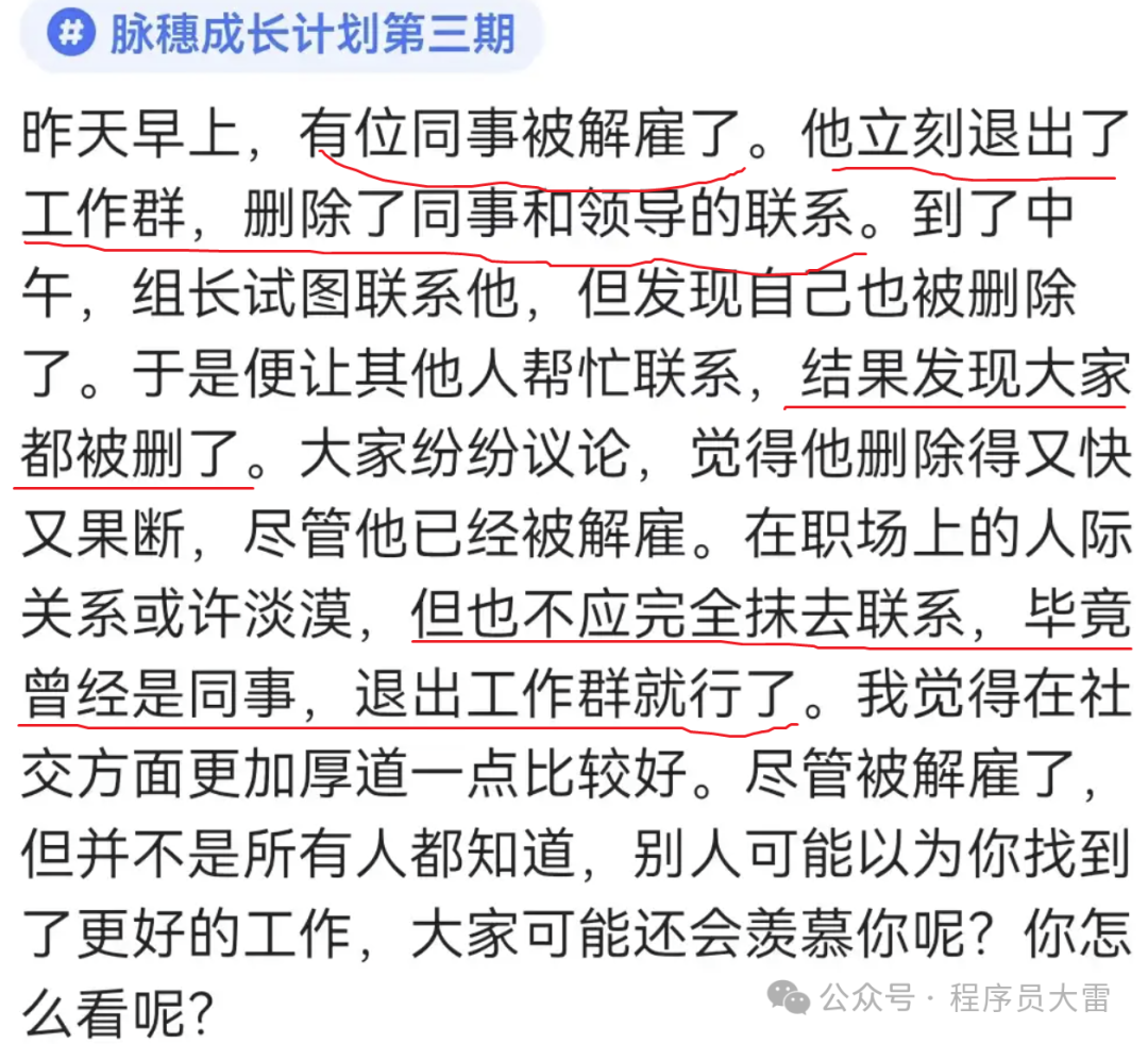 像那些自己主动离职,或者想哪天再回来的,建议就别急着删微信了,毕竟山水有相逢,说不定哪天还得打交道,删了再想加回来,那可就尴尬了。