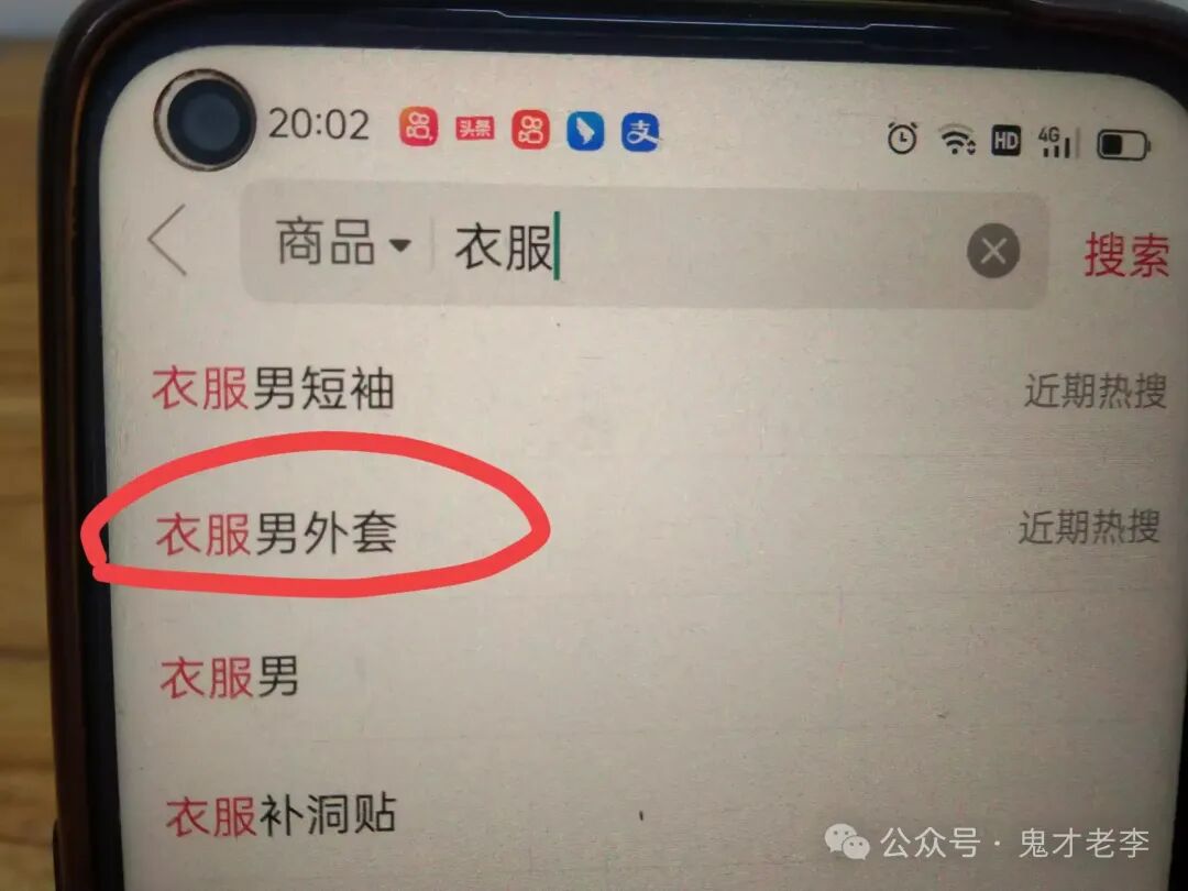 点击搜索框,然后输入我们想要购买的商品,比如衣服男外套,(如上图所示)