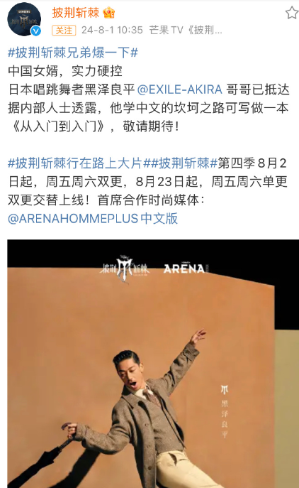 很少参加海外综艺节目的黑泽良平,最近参加了中国《披荆斩棘》登台演出。