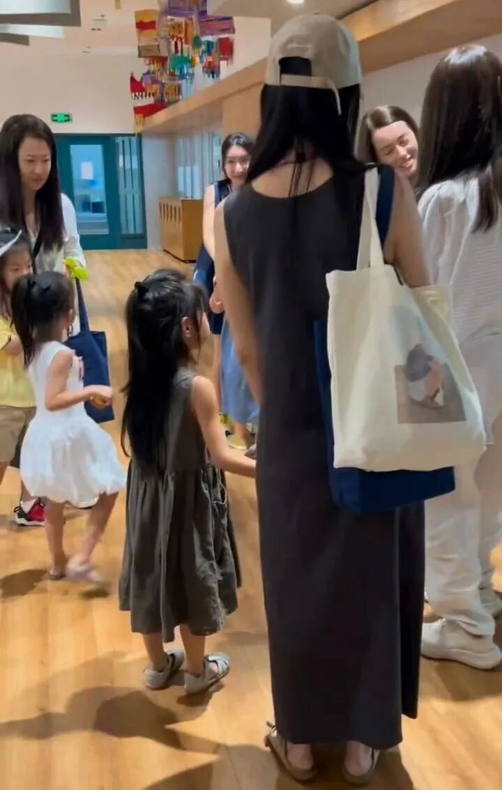 妈妈也没有精心打扮,背着帆布包,穿着凉鞋,表现得特别休闲和松弛,在人群里较为低调,看背影跟普通的学生家长看起来没什么区别。