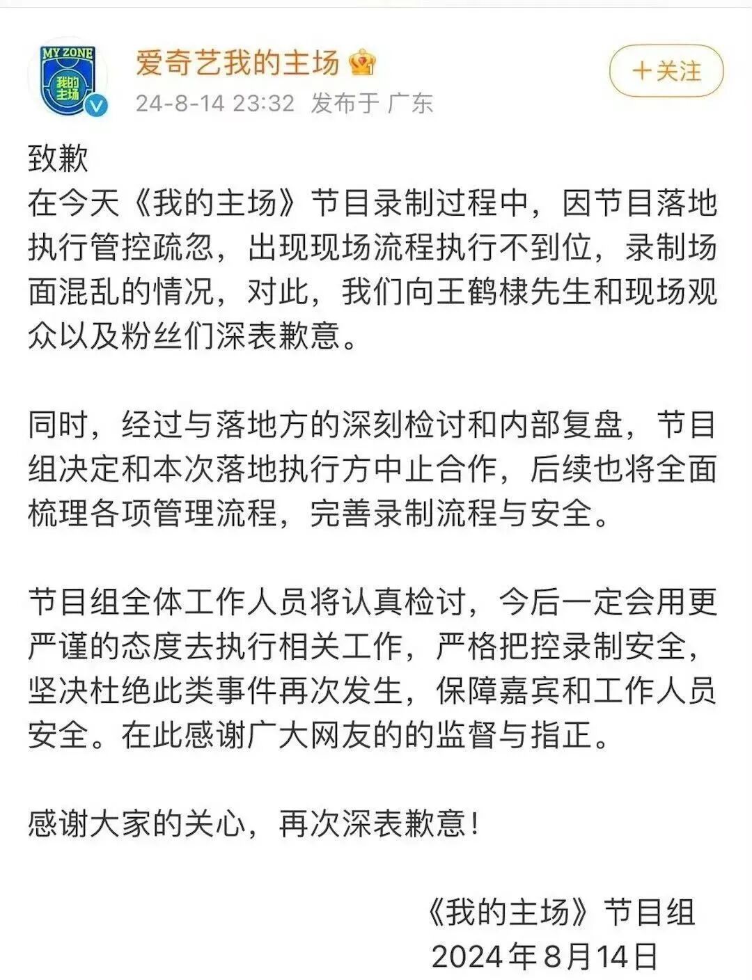 同时,经过与落地方的深刻检讨和内部复盘,节目组决定和本次落地执行方中止合作,后续也将全面梳理各项管理流程,完善录制流程与安全。