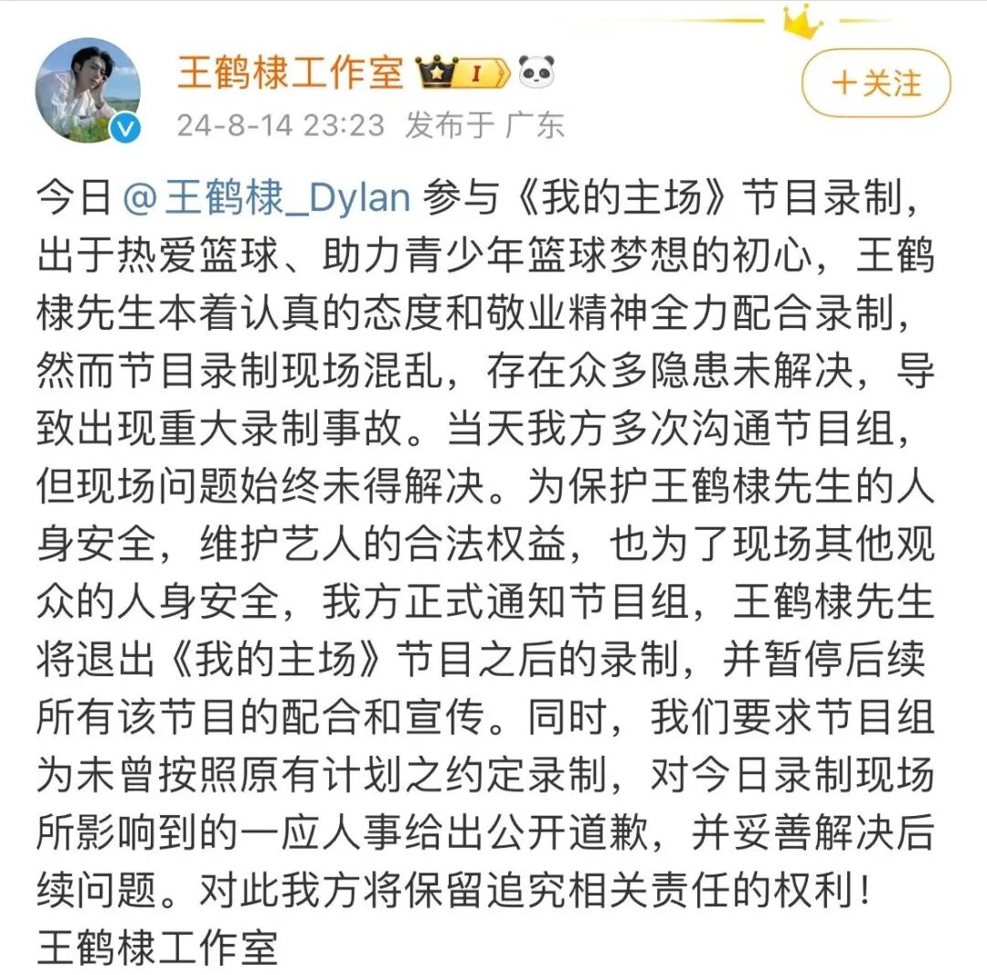 我方正式通知节目组,王鹤棣先生将退出《我的主场》节目之后的录制,并暂停后续所有该节目的配合和宣传。