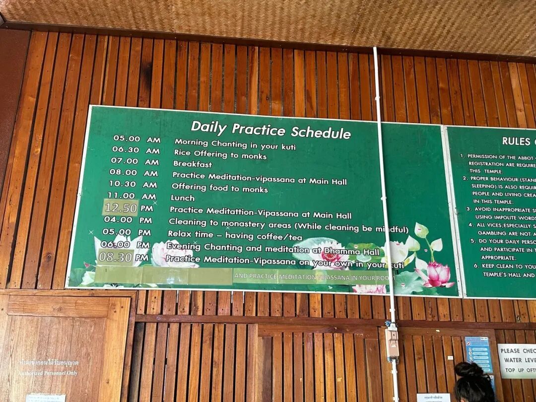 每天会有现煮咖啡、茶叶、巧克力粉,可以自己冲泡,只提供早餐、午餐两餐,僧人过午不食,饿了可以去小店买点吃的。禅修衣服每天可换不用自己洗,把脏衣服放在拿衣服前面洗衣机屋子的脏衣篓里。这里免费吃喝住,但看到力所能及的事情可以主动帮忙,比如洗菜/洗碗/扫地等。僧人是泰语和英语授课,需要一定的英语基础,不懂也没关系,一定会有懂英文的中国人在,而且每天课程安排都是固定的,跟着别人做就没问题。