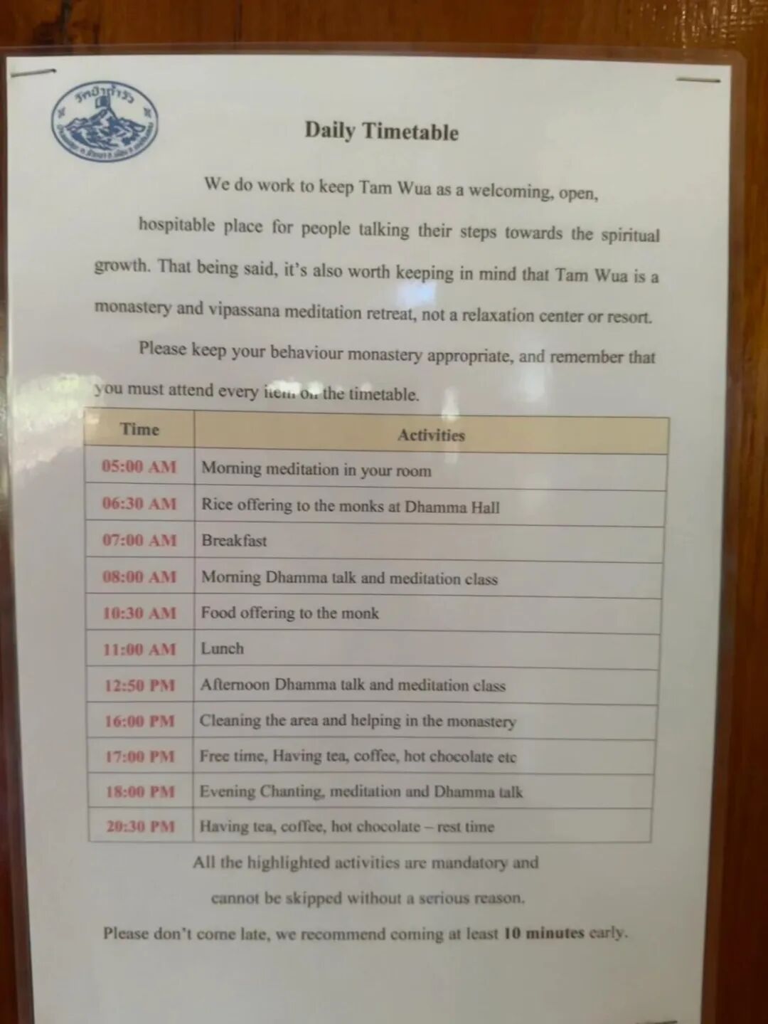 无需预约,拿着护照本直接来到information报道,登记好个人信息及逗留天数,志愿者会分配大通铺/独栋房子,都是根据人数/住的天数随机分配,不好说!报道完后去洗衣房那边找到志愿者拿床上用品,去选一套合身的禅修服,就可以开始接着跟当天的时间表上课,每日安排如下:
