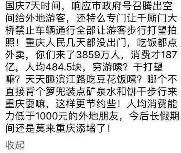 但最后一算账,有点蒙圈:这些游客的人均消费只有482元,是人均消费1418元的成都零头,也难怪憋在家里的重庆人会发朋友圈抱怨了。
