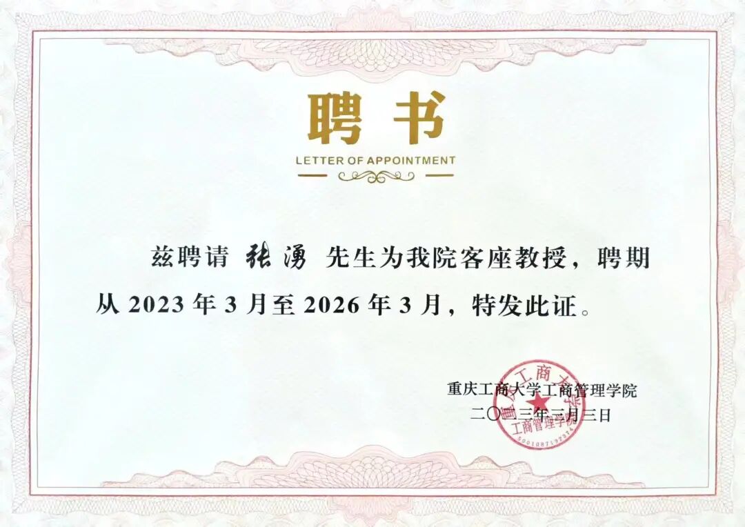 很荣幸地成为了重庆工商大学的客座教授。