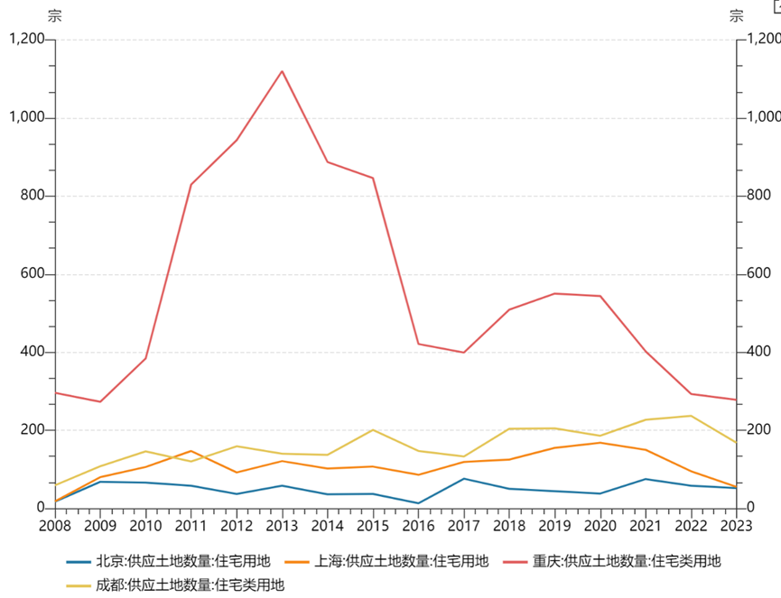 如果拿北京上海重庆成都进行比较,北京的土地供应量也是各个城市中最低的,重庆则高了近10倍。