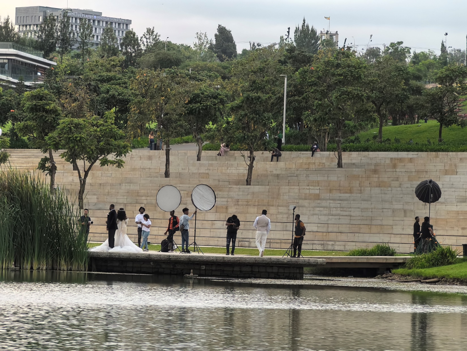 公园旁边建有一条人工湖,许多本地人都爱去湖边拍婚纱照。