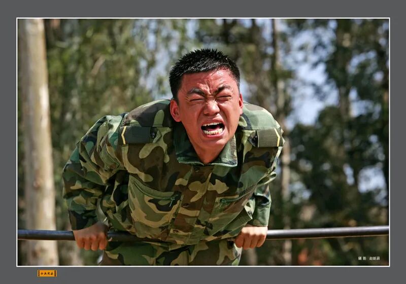 嘈杂的环境里的自律才最耀眼。他带着那股耿直的傻劲儿,每天背着石头出操,参加野地拉练,帮着营地去修路。自己的弱项腹部绕杠,刚开始一个都做不成,天天练、天天练,最后能做三百三十个,当之无愧成为“兵王”。