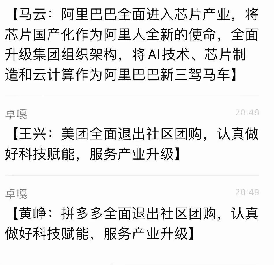 习大大说话掷地有声,大佬们这回反应迅速,昨天有谣言传出,阿里、美团、拼多多等互联网大佬就纷纷宣布全面退出社区团购,转向芯片等高科技领域,做好科技赋能,服务产业升级。
