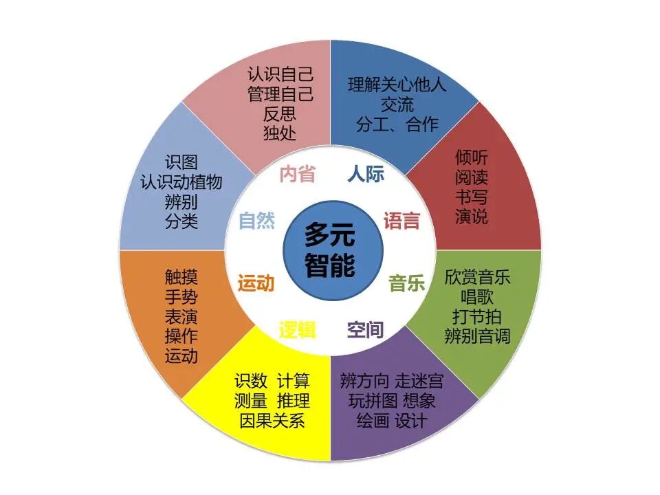 多元智能理论里说,每个人身上至少存在7项智能,即语言、数理逻辑、音乐、空间、身体运动、人际交往和自我认知。