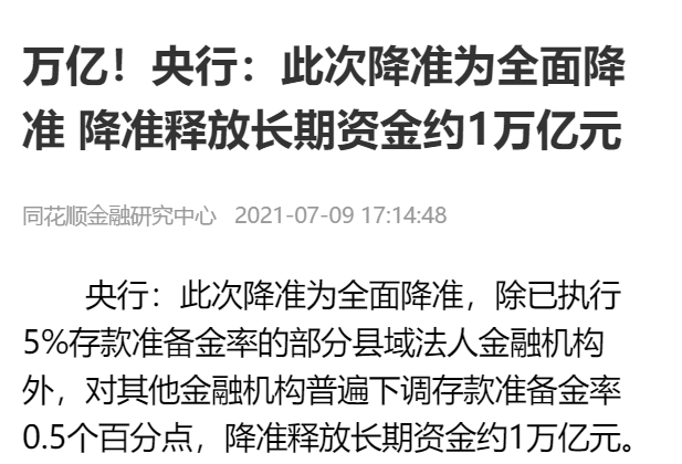 这两天,央行宣布7月15日开始全面下调存款准备金率0.5个百分点,释放长期资金约为1万亿元。
