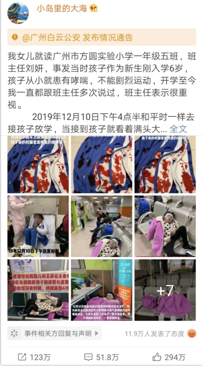 在公众刻板印象里,在与教师进行对抗时,孩子是天然的弱势群体,理应得到救助和声援。这也是为什么去年微博上@小岛里的大海在微博造谣学校老师体罚孩子,导致孩子吐血的微博,赢得了网友的百万次的转发和声讨。