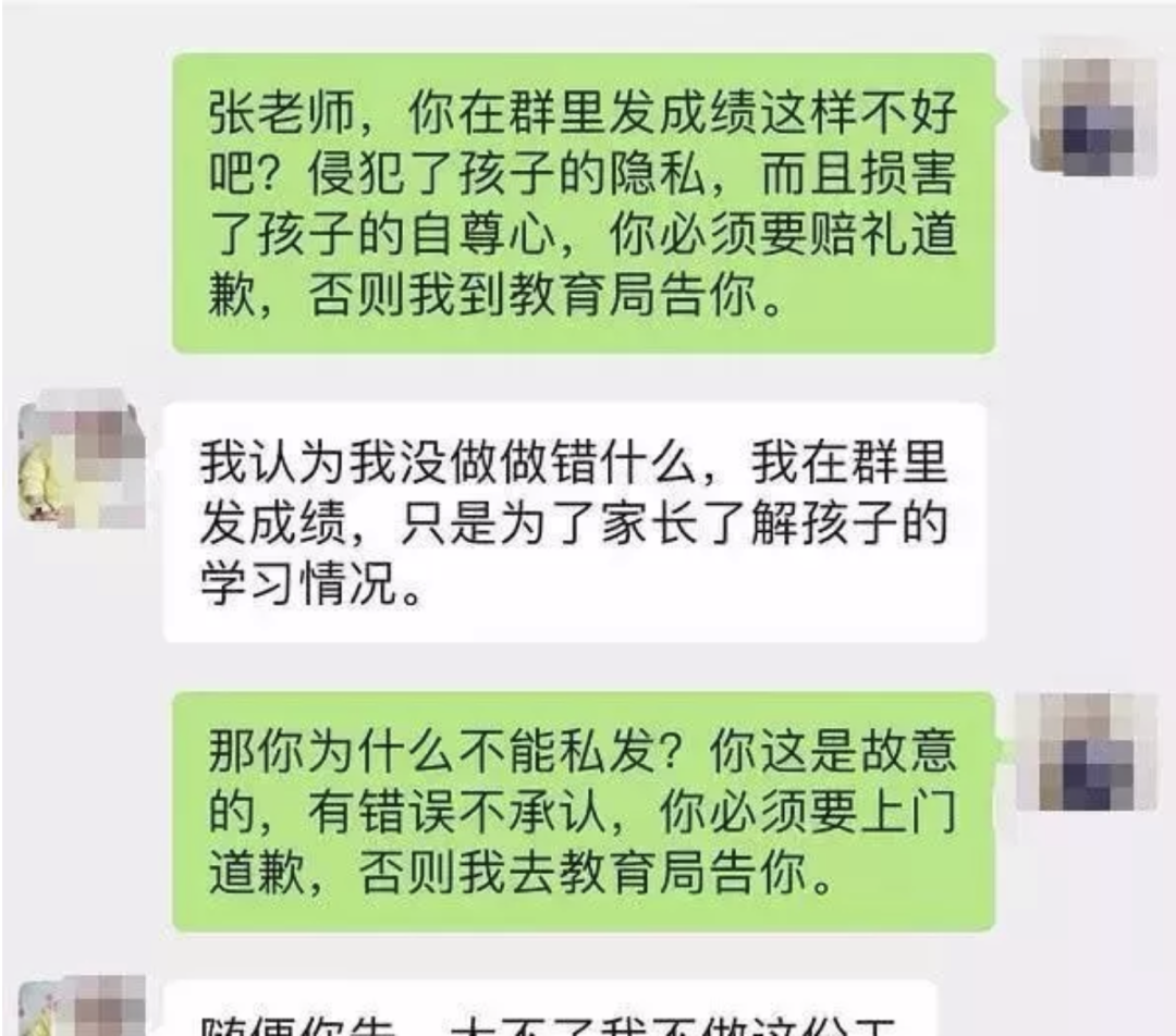 就在前段时间,一位老师因把默写成绩发到班级群里而被家长指责没有保护学生隐私,老师被威胁投诉到教育局。无奈之下,老师写了封辞职信,一字一句令人心疼,“育人尚无功,怎可害人命!”
