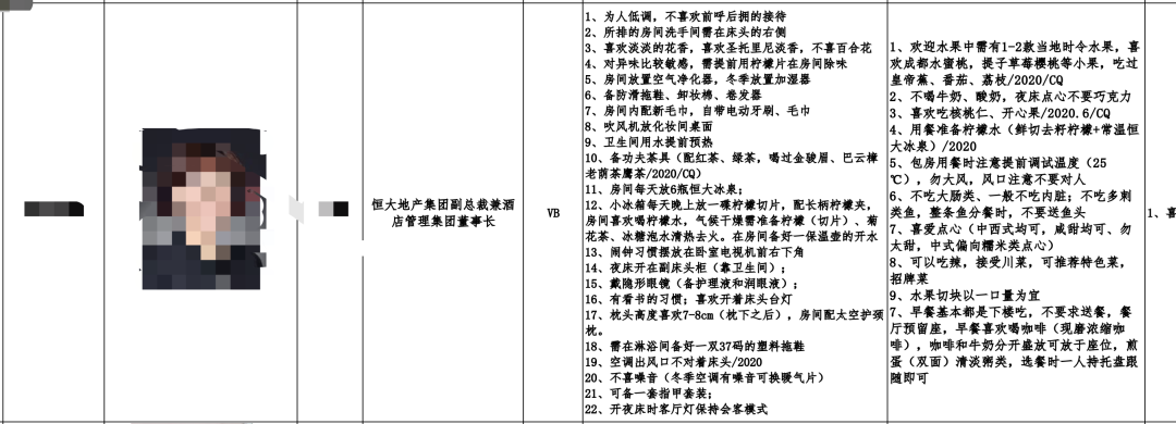 恒大地产集团副总裁兼酒店管理集团董事长(应该也是这个酒店的直属领导),光是客房喜好就长达11条、饮食喜好8条,随便放几个: