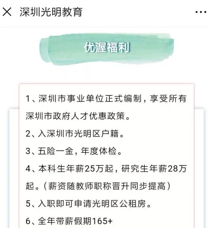 年薪40万; 深圳市事业编; 子女配套最好的教育; 两居室公产房; 160多天的寒暑假。