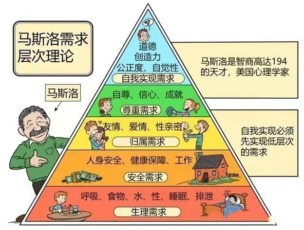他说,人的需求分为五层,包括生理、安全、社交、尊重,以及自我实现,层层递进。