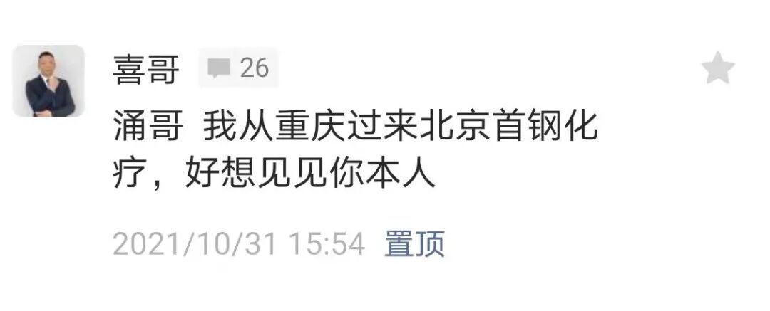 “湧哥,我从重庆过来北京首钢化疗,好想见见你本人”。