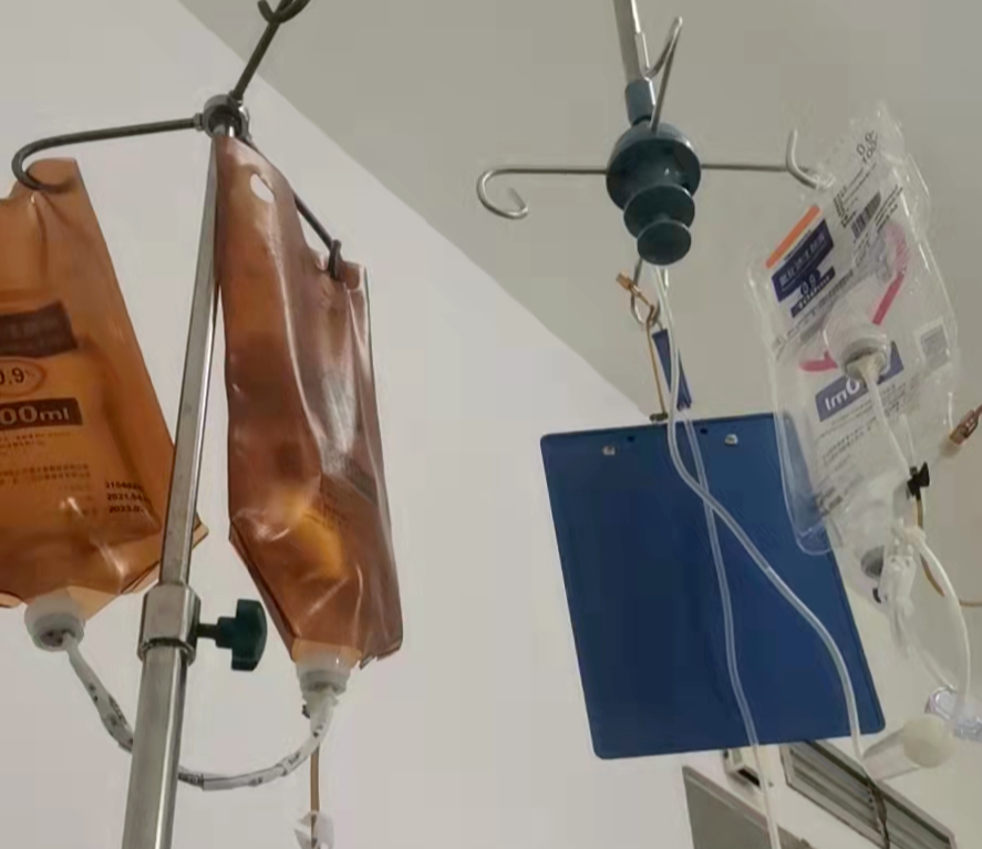 他已经无法在我面前掩藏自己的痛苦:“真难受!天天几十袋液体,从早上一直输到半夜”