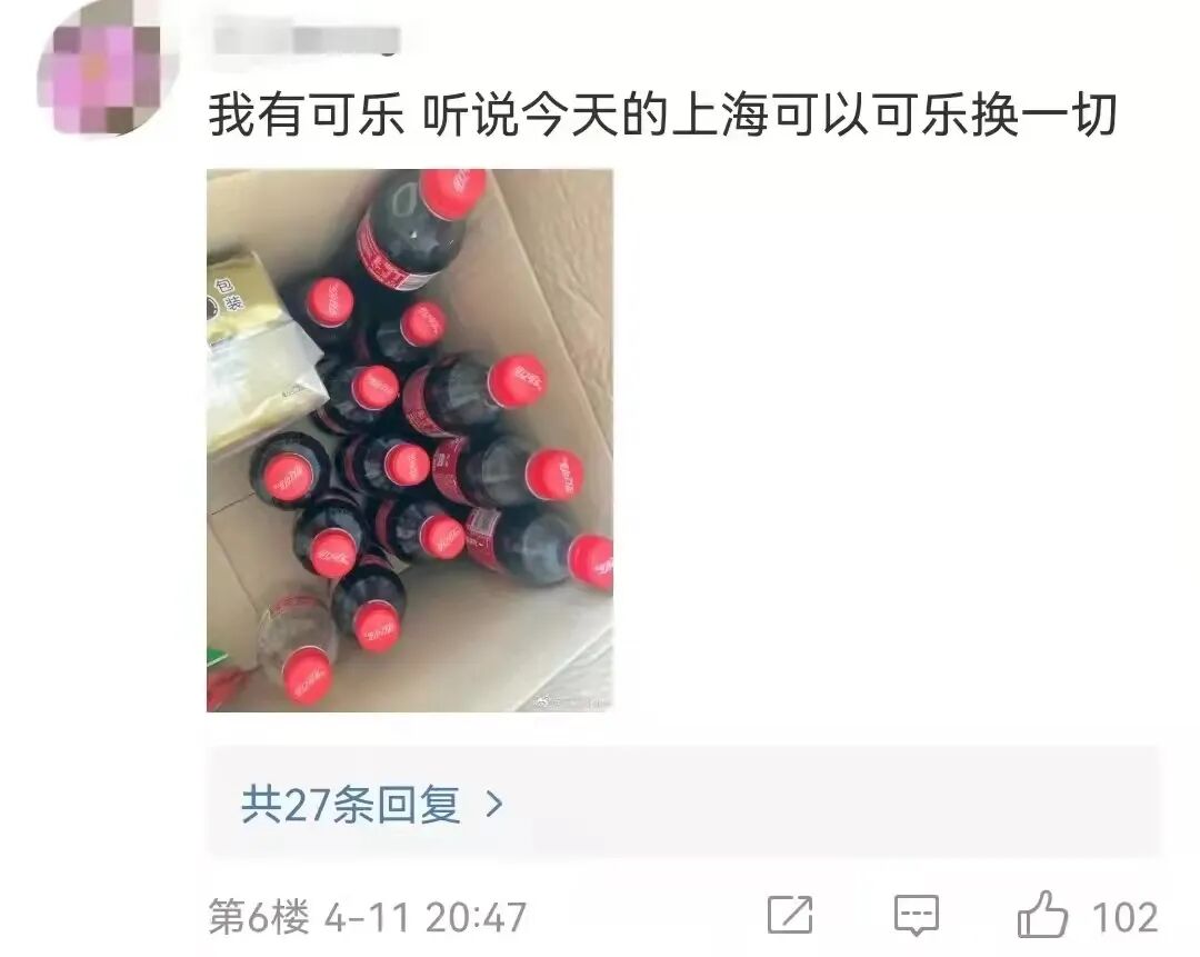 一开始,大家还在网上说上海人生活优雅精致,乐呵转发“上海爷叔核酸检测排队时喝红酒”“上海小区解封后第一件事喝咖啡”等段子。