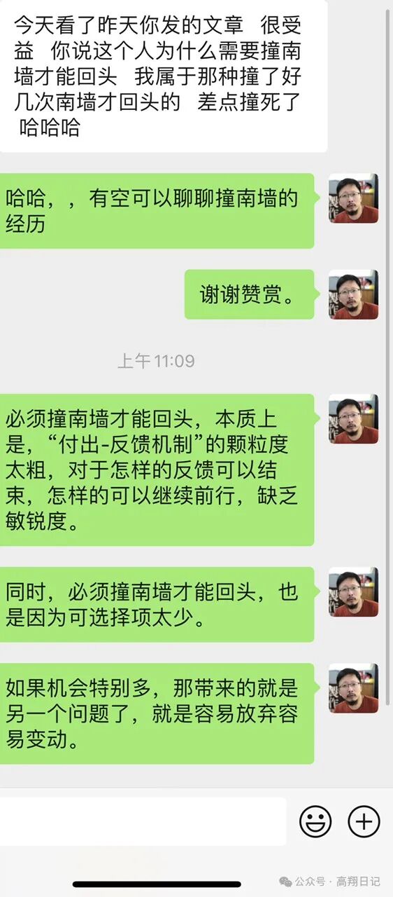 04,必须撞南墙才能回头,本质上是自己的【付出-反馈机制】的颗粒度太粗,对于怎样的反馈可以结束,怎样的反馈自己可以继续前行,缺乏敏锐度。