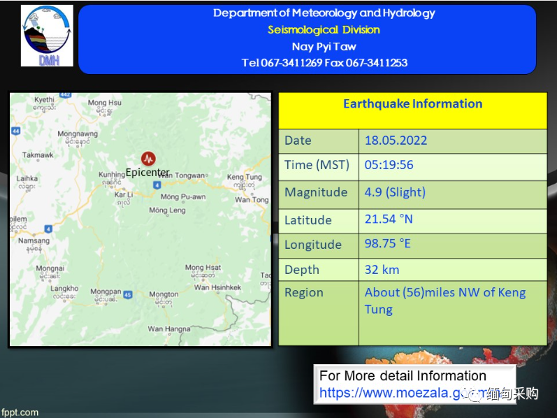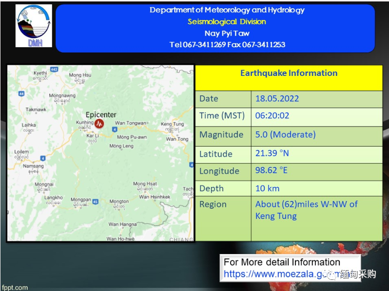 6时20分,掸邦境内又发生了一次5级地震,震中位于景栋西北偏西方向约100公里处(北纬21.39度,东经98.62度),震源深度10公里。