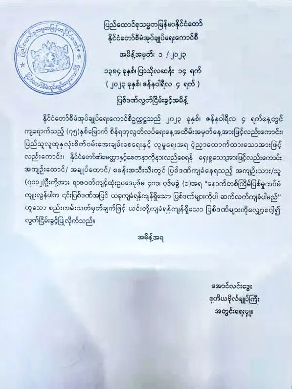 特赦令显示,2023年1月4日之前,犯下杀人罪、强奸罪、爆炸物相关罪名、与非法组织联络罪,以及触犯《1878年武器法》19(F)条例、触犯《1949年武器法》、触犯《1951年武器法》、触犯《1924年掸邦武器法》、触犯《毒品法》、触犯《自然灾害事务管理法》、触犯《反恐法》、触犯《反腐法》而被判刑者不获得减刑权,因其他罪名被判刑的人均获特赦,减去六分之一的刑期。