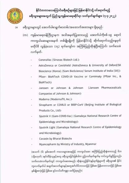 入境人员抵达缅甸前的14天,已经完整接种了获得缅甸卫生部批准的新冠疫苗。疫苗接种证明中,必须用英文或缅文标注清楚疫苗所属国家、名称以及接种日期。如果6岁以下儿童,与接种了疫苗,符合入境规定的父母或监护人一同入境缅甸,则可免除此要求。