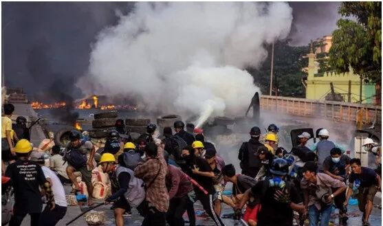 在愈演愈烈的镇压行动中,浓烟从仰光的一座桥上升起,这座桥通往后来于去年3月18日实施戒严的莱达雅工业园区。