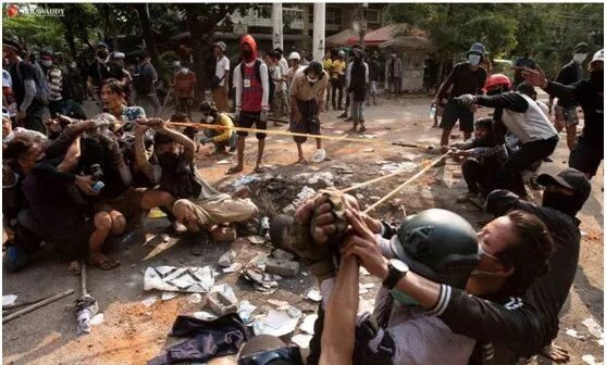 去年3月29日,仰光的活动人士用燃烧弹、弹弓和简易散弹枪反抗全副武装的政权部队的镇压。