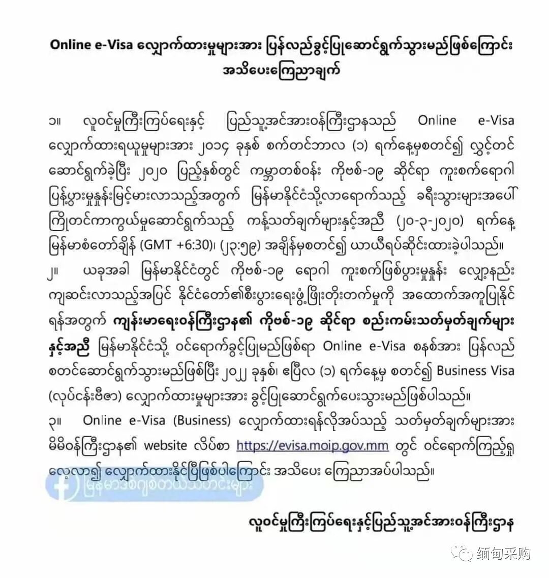 缅甸移民和人口部于3月29日发布公告将自2022年4月1日起重新开放线上申请电子商务签证,重新开放线上申请电子签证(Online e-Visa)公告