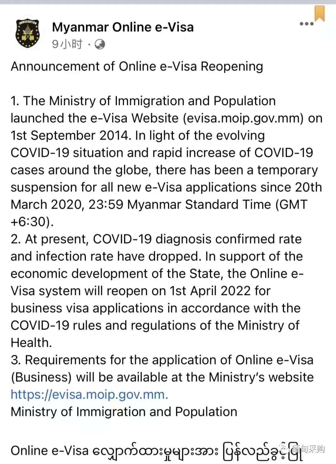 2. 目前,缅甸国内因COVID-19确诊率及感染率均有所下降,以及为支持国家经济发展,将根据缅甸卫生部COVID-19 疫情相关规定批准入境缅甸,重新开放电子签证;因此将自2022 年4 月1 日重新开放线上申请电子商务签证(Business Visa)。